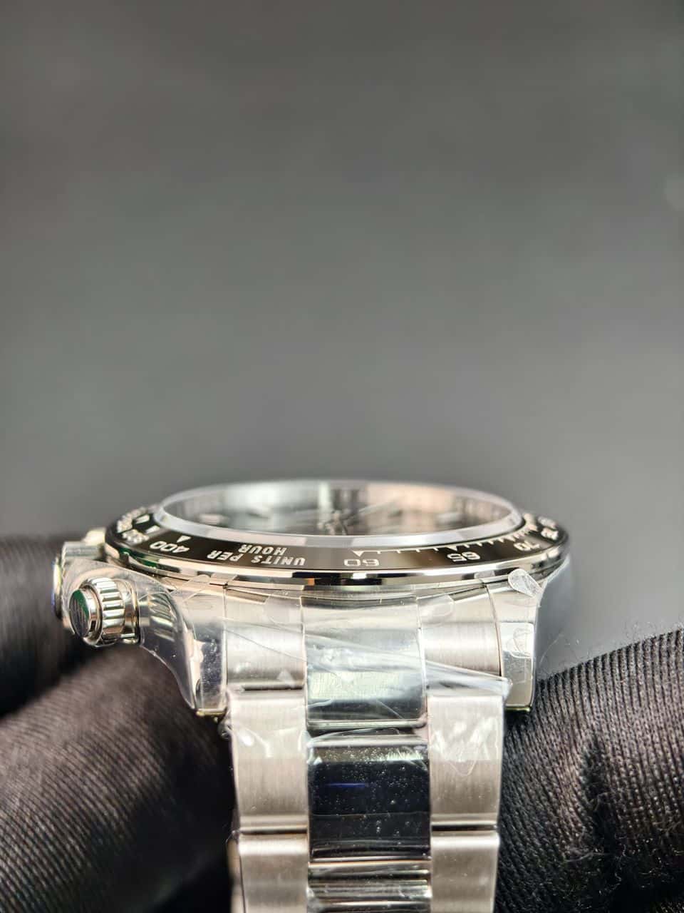 - Bezel: Black Cerachrom ceramic tachymeter bezel with “Units per Hour” scale